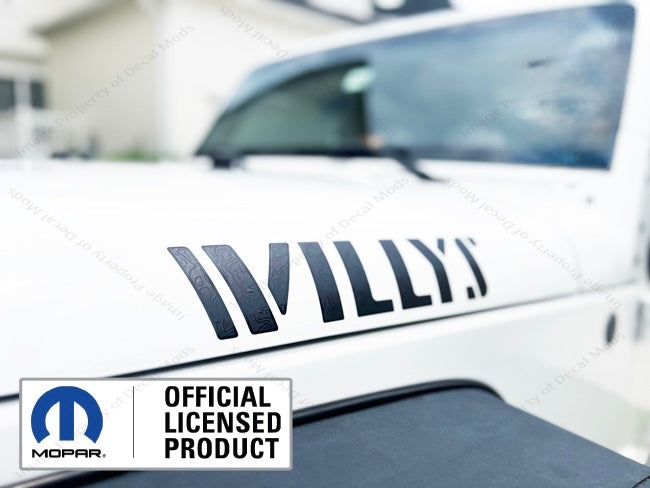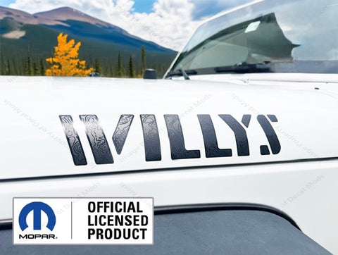 This set includes the following: - Set of 2 - WILLYS hood decals ( Part number: UV1A4 ) - Decals are in the color: Gloss Black Outline, Matte Black Fill, Gloss Map Lines - Installation Instructions |