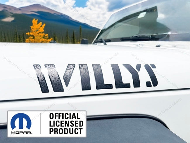 Upgrade your Jeep 'Willys' with officially licensed Mopar “WILLYS” hood decals featuring a unique 3D topographic map design. Each decal set is precision cut for a perfect OEM-style fit and is available in a wide range of color options to match your Jeep’s personality and build.